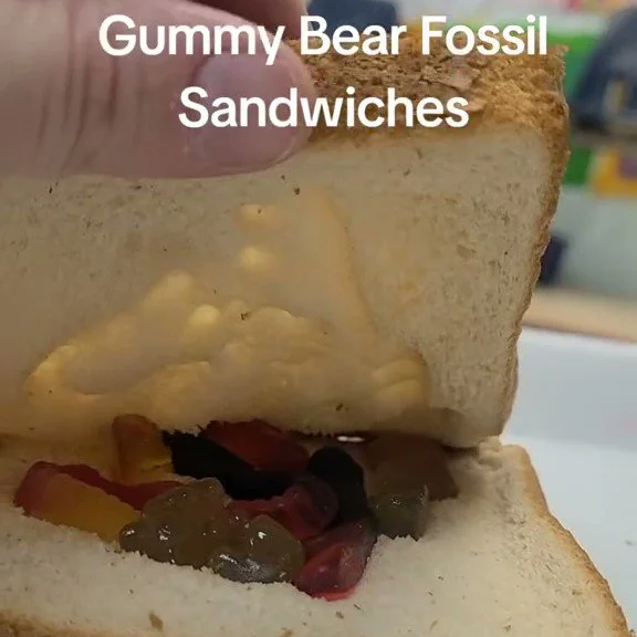 The Gummy Bear Fossil Sandwich activity helps preschoolers understand how fossils form using a simple, squishy, and unforgettable experiment. Children place gummy worms between slices of bread, press them together, and leave them overnight to model how pressure over time creates fossil imprints. When the bread is lifted the next day, kids observe the shapes left behind and learn that fossils are often imprints, not bones. This playful Earth science activity builds observation skills, introduces cause and effect, and makes complex fossil concepts clear, concrete, and deliciously memorable for young learners.